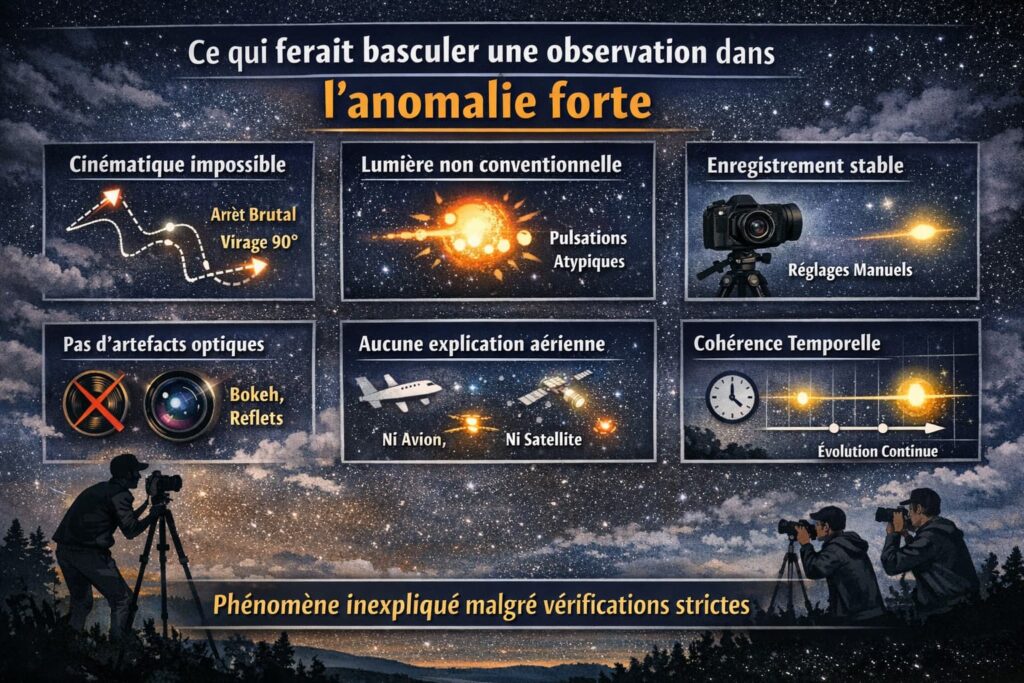 Une observation bascule dans la catégorie anomalie forte lorsqu’elle dépasse clairement le cadre des confusions techniques, optiques, atmosphériques et aéronautiques connues, sans qu’aucune hypothèse conventionnelle ne reste plausible après vérification. Ce basculement ne repose pas sur l’étrangeté perçue, mais sur l’accumulation de critères techniques convergents.
